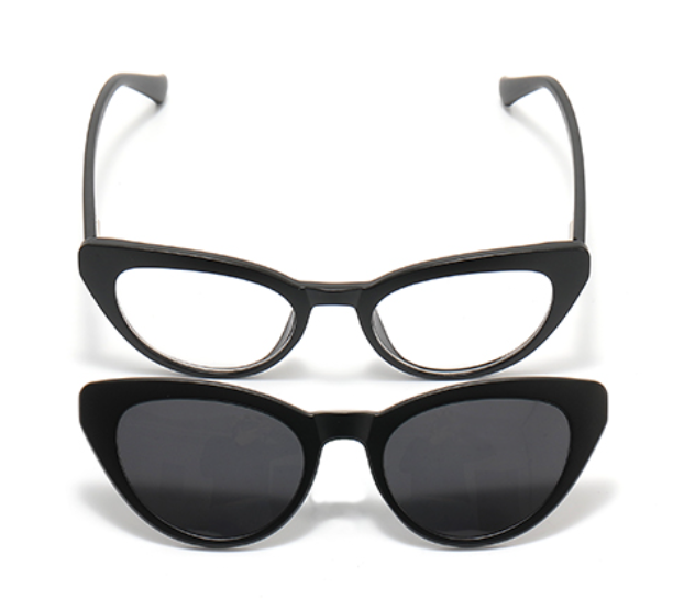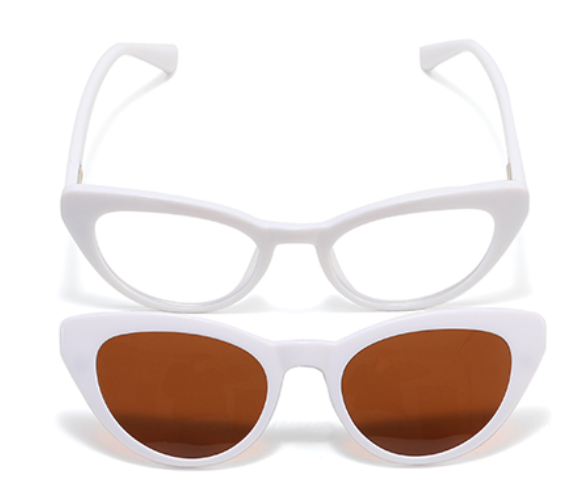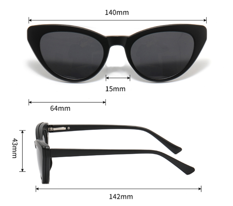 These super cute cateye glasses with handy clip on polarized lenses mean you can keep your vintage aesthetic alive both inside and ourtside. The clip on lenses are super secure with both a nose clip and magnets in the corners of the frame and cover and the sping hinges make them really comfy for wide faces. In our opinion these cateye sunglasses are on the smaller side. All your sunglasses come in a handy Retro America branded cleaning pouch to help protect them