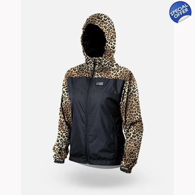 These rad leopard windbreaker jackets are made from recycled plastic bottles.! They've received a durable water-repellant treatment and have mesh lining and a droptail for added protection while sitting of on a bike. The velcro adjustable wrist cuffs, side pockets with reverse coil zippers and lined hood with adjustable drawcord make sure the wind and rain is kept out and the adjustable drawcord in the hem helps keep the warmth in