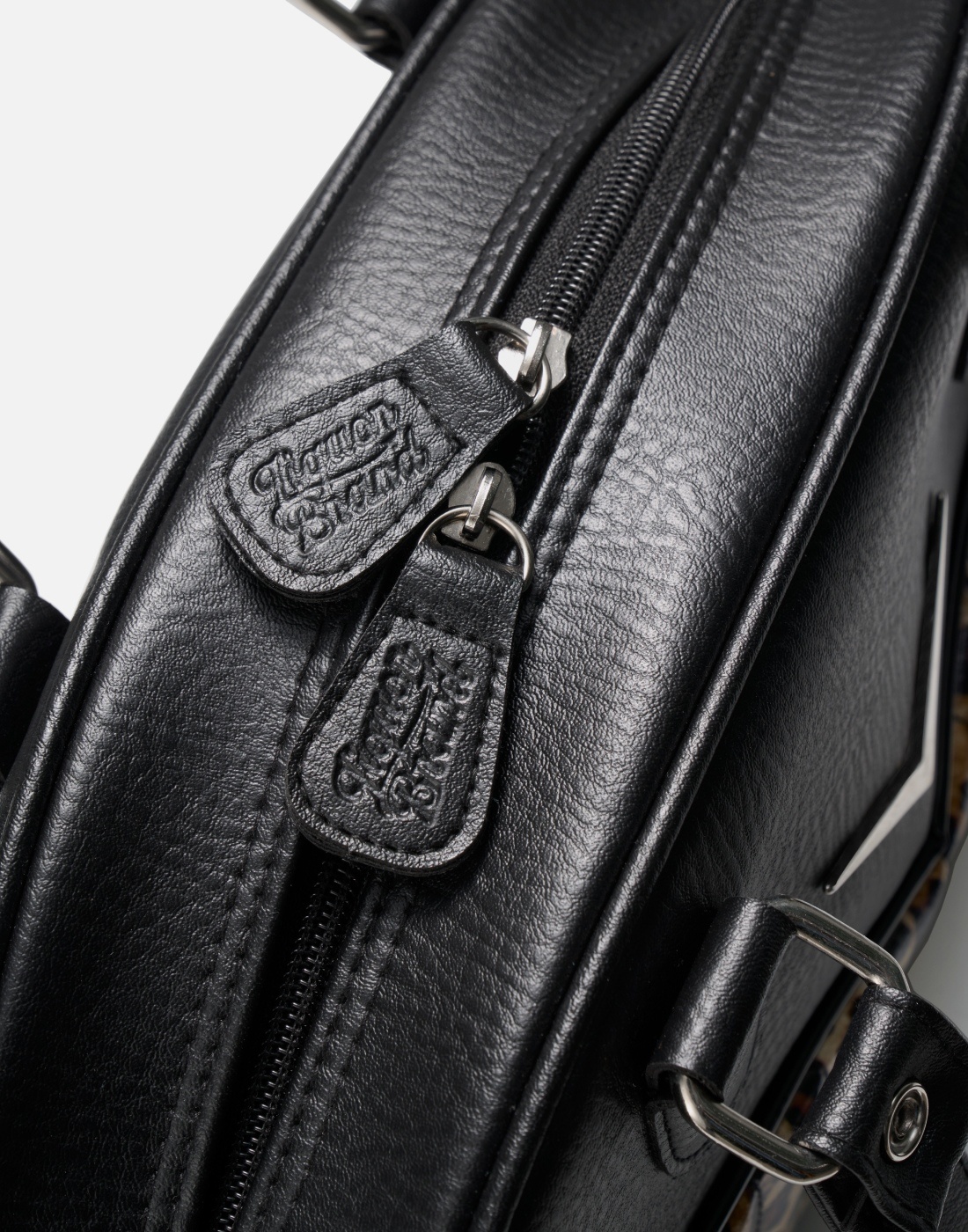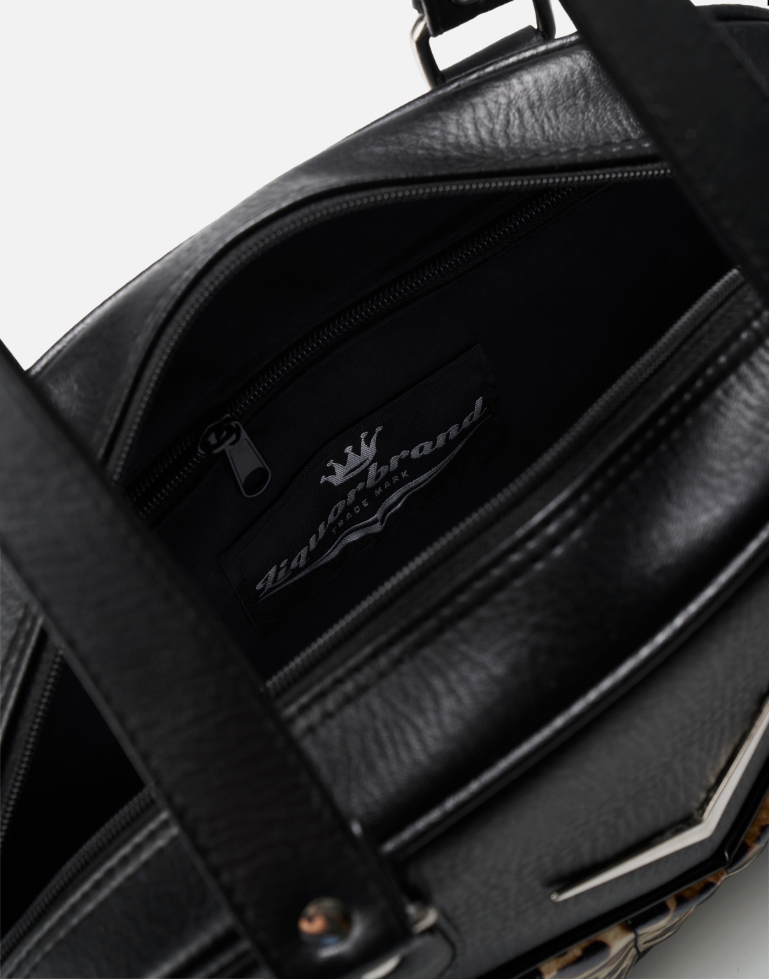 Vegan friendly with glitter tuck n roll, metal feet, LiquorBrand Chevron V logo hardware, two inside pockets and zipper pocket