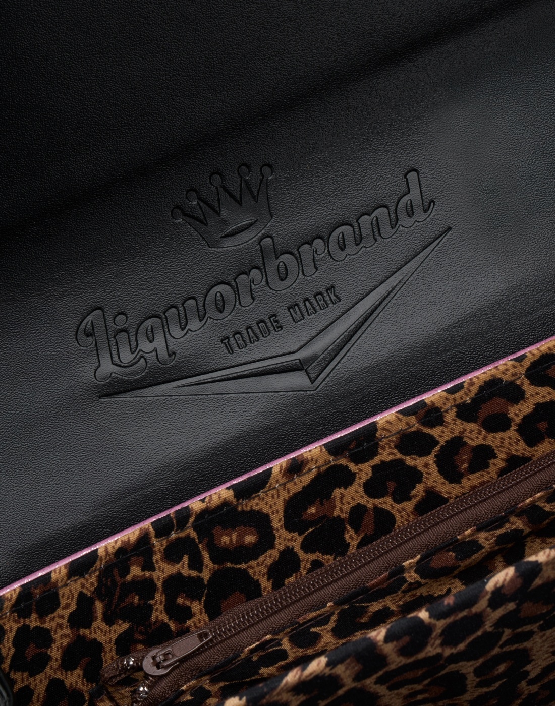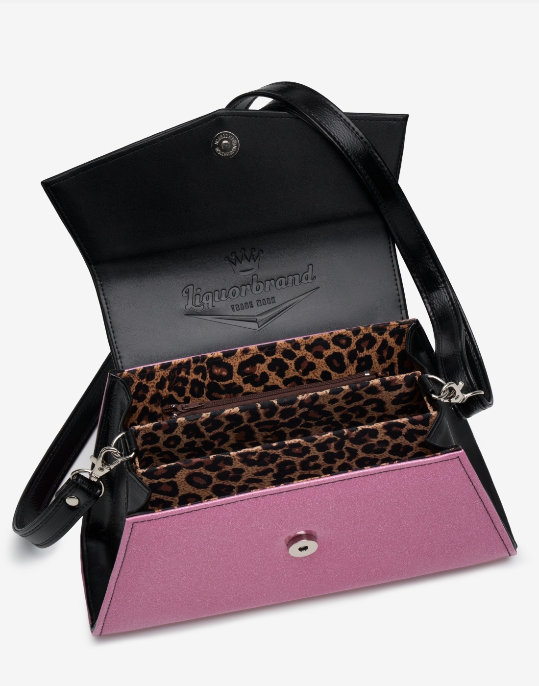 These Liquorbrand Chevron purses are a must for every pinup & rockabellas wardrobe. In sparkle vinyl, they have leopard lining, 3 internal pockets, magnetic close, metal feet, Chevron logo, a handle and adjustable shoulder strap