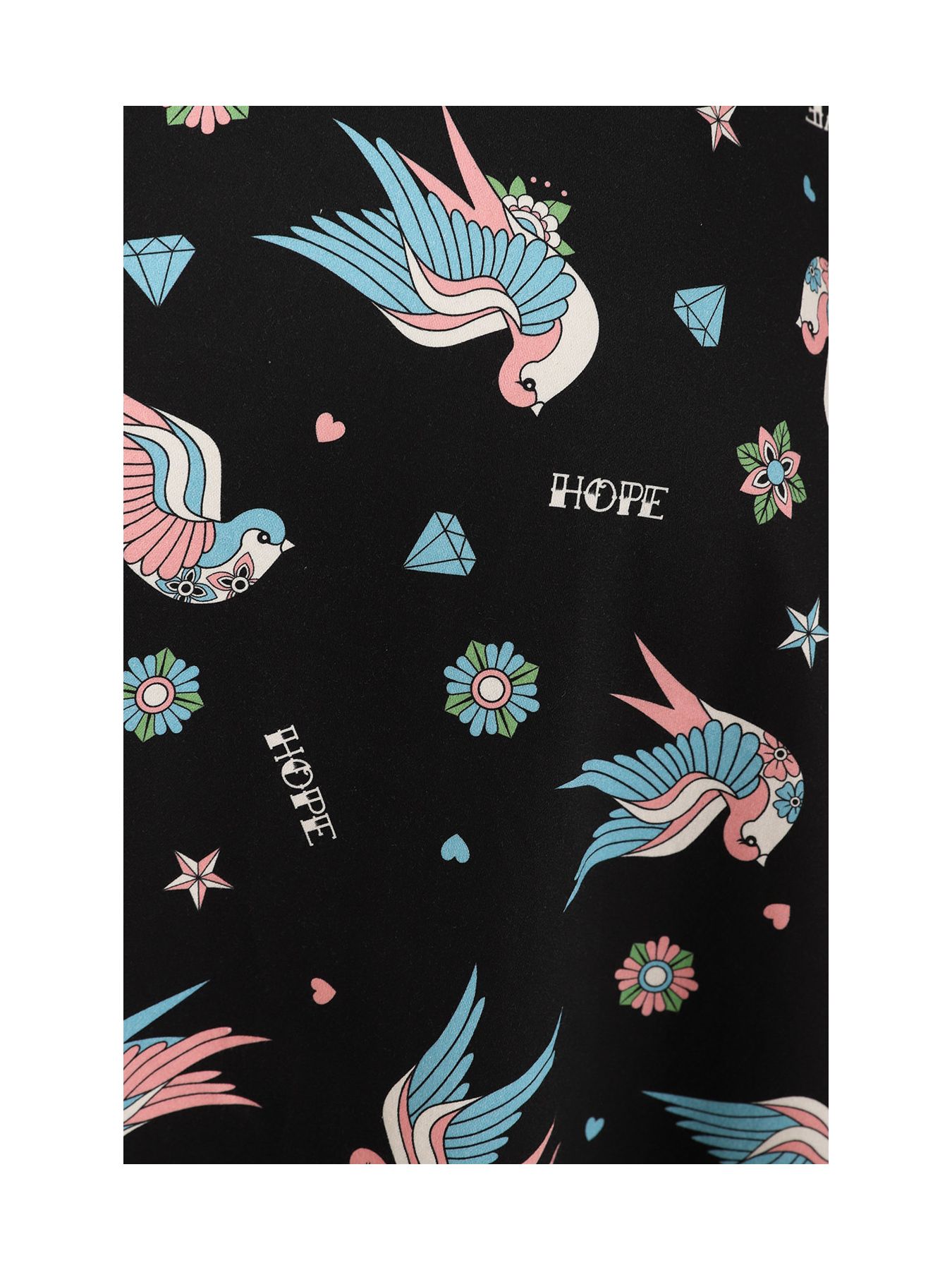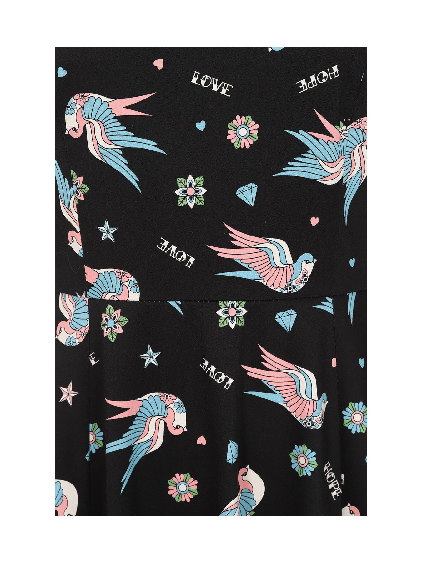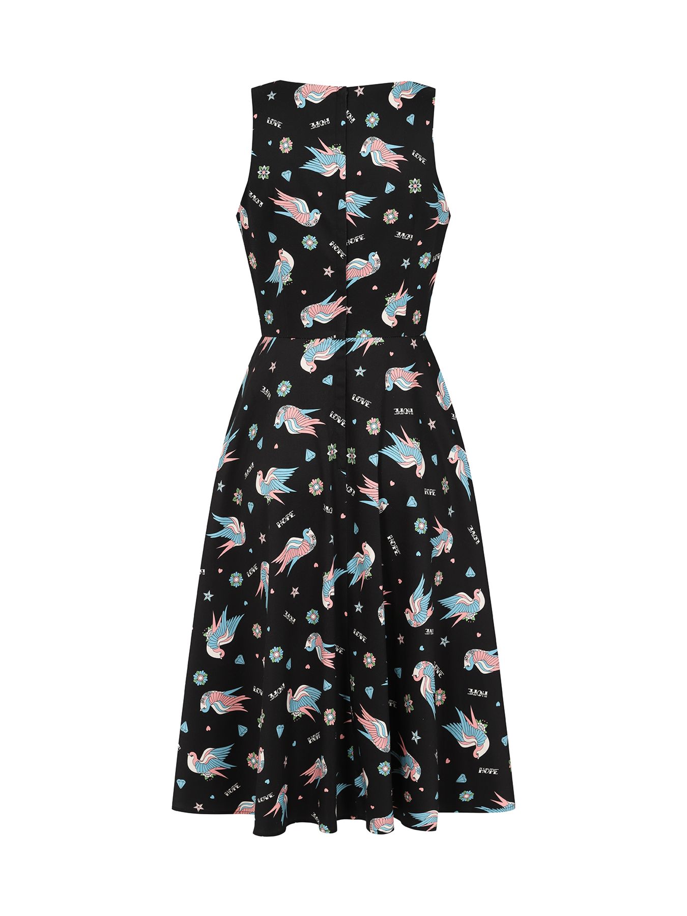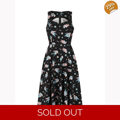 This charming Marilou Swallow print rockabilly inspired dress in fit and flare style has just the right amount of attitude with the swallows and tattoo flash print and cuteness in pink and blue colourway finished off with pockets!