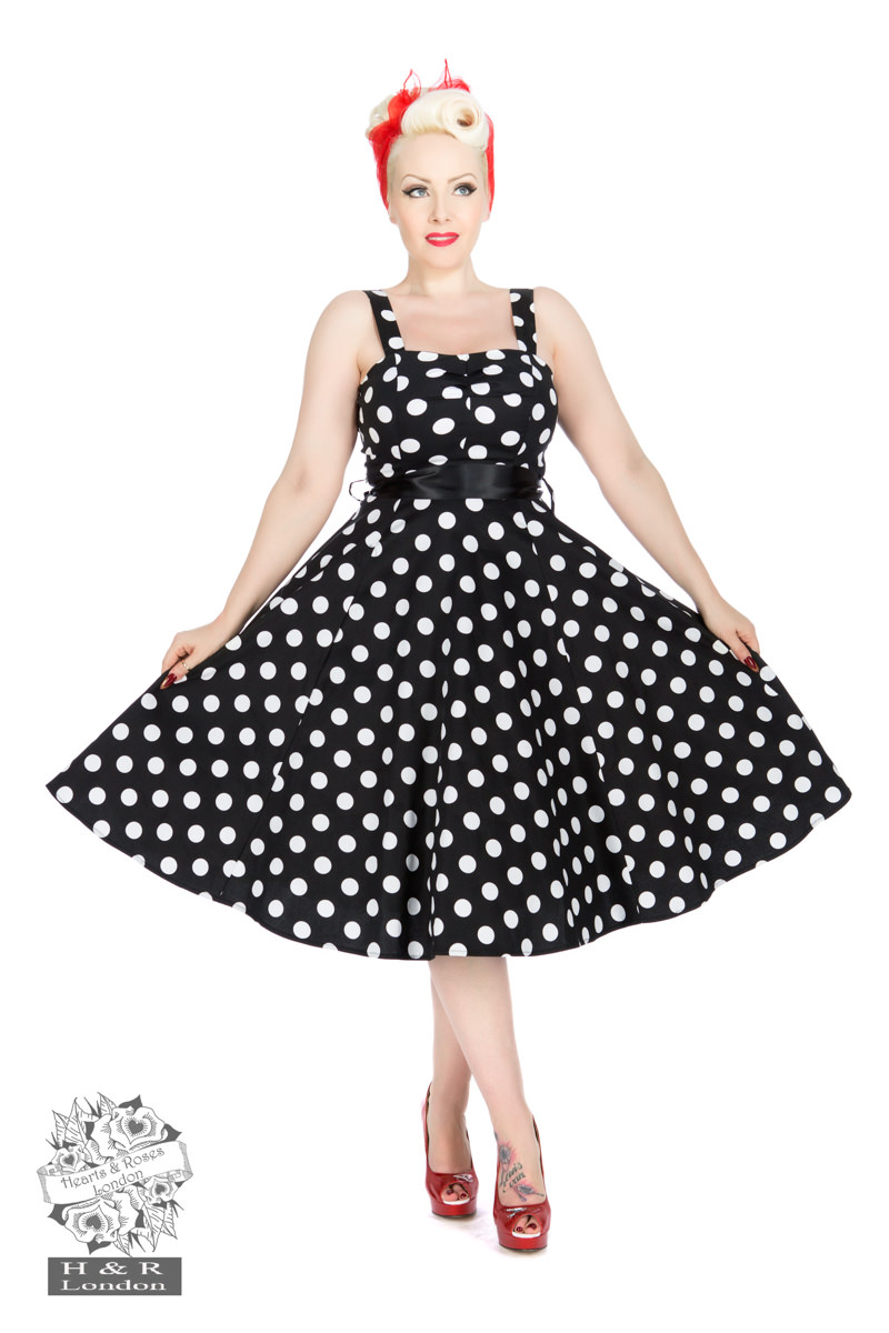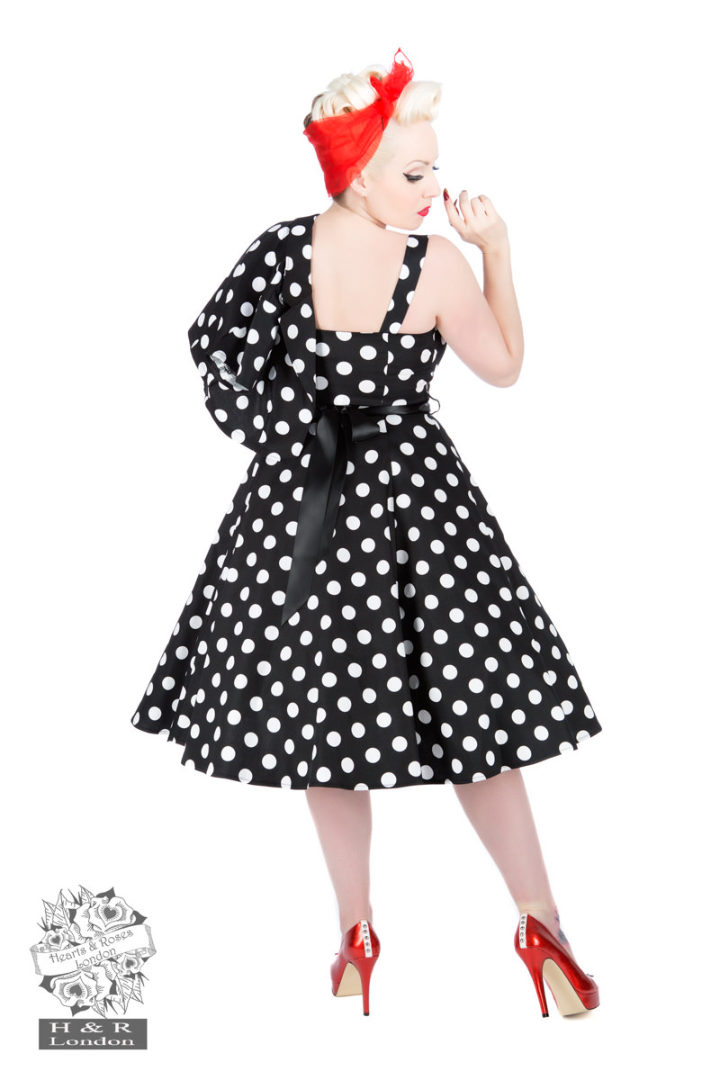 Step out in style in H&R London's Polka Dot Swing Dress with Bolero! A classic pinup outfit, the Polka Dot Swing Dress with Bolero is a black cotton sundress with a full swing skirt and matching short-sleeved bolero jacket. Bust line of dress has a bit of ruching for a flattering fit