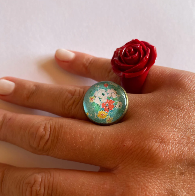 We just love the bold and beautiful red rose ring Made from a red resin, this ring is fabulous! Available in one size, US ring size 6.5. The band width is 16.9mm. It was designed to be worn on the pinky finger.