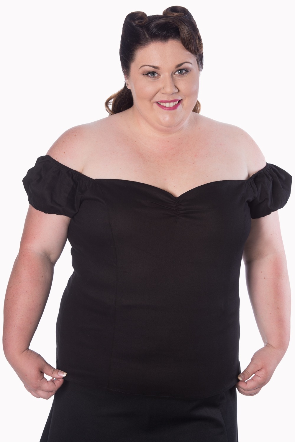 The classic Winnie Top is a wardrobe staple for any pinup or rockabily doll! With a super flattering sweet heart neckline this top pairs beautifully with skirts and pants and is the perfect length to be worn tucked in or untucked. The elasticised sleeves can be worn off or on the shoulder. Side zip